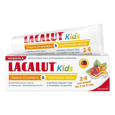 LACALUT (рус. Лакалют) - немецкая торговая марка высококачественных зубных паст, ополаскивателей, зубных щеток, зубных нитей, средства для зубных протезов и других средств по уходу за полостью рта. LACALUT ЗУБНАЯ ПАСТА KIDS ДЕТСКАЯ 2-6 ЗАЩИТА ОТ КАРЕСА И УКРЕПЛЕНИЕ ЭМАЛИ. Специальные особенности: не содержит парабенов и SLS. Содержание ионов фтора 1000 ppm. Абразивность 17 (цветная фаза) и 40 (белая фаза). Детская зубная паста Lacalut Kids создана специально для детей от 2 до 6 лет. Вкус сладкой мяты очень нравится детям, паста безопасна при проглатывании. Двойная комбинация фторидов и ксилит эффективно предотвращают развитие кариеса и снижают образование бактериального налета. Кальций и гидроксиапатит реминерализуют и полируют зубную эмаль, витамины А и Е ухаживают за деснами.