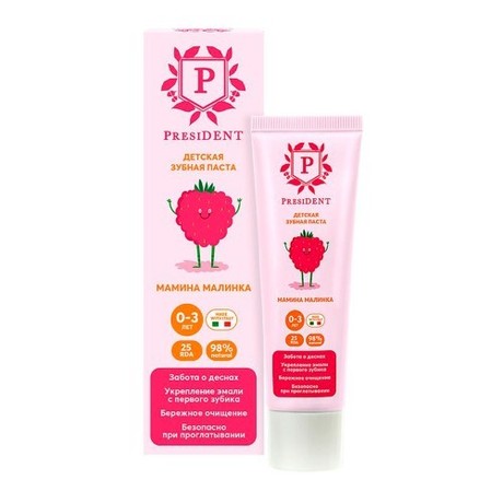 Детская зубная паста PresiDENT Мамина малинка предназначена для ежедневного ухода за полостью рта малышей от рождения до трех лет. Формула пасты разработана с учетом нежной и чувствительной эмали молочных зубов, а также особенностей детских десен. Паста имеет низкий уровень абразивности (25 RDA), что делает ее безопасной для частого применения.