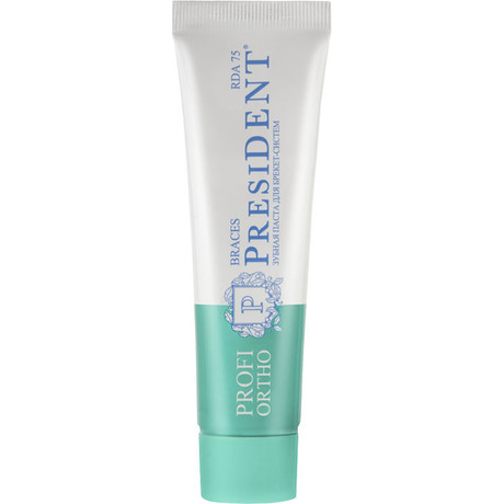 Бренд PresiDENT Линия Profi (PROFESSIONAL) - ПРОФЕССИОНАЛЬНАЯ КОЛЛЕКЦИЯ - Коллекция специализированных средств по лечению и уходу за полостью рта. Для тех, кому нужен дополнительный уход за зубами и деснами. Средства усиленного действия PROFI ORTHO дополняют серию PROFI - комплекс средств для осуществления профессионального ухода за полостью рта и создания максимального комфорта в период использования брекет-систем. Зубная паста ПРЕЗИДЕНТ PROFI ORTHO ЗУБНАЯ ПАСТА BRACES (75 RDA) - защищает от кариеса и зубного камня, предотвращает воспаление, освежает дыхание. Применяется при использовании ортодонтических конструкций, в том числе брекет-систем. Эффективная защита. Активные компоненты: - Папаин и Ананас расщепляют белковый налет. - Корень солодки подавляет рост бактерий. - Алоэ ускоряет заживление. - Бисаболол уменьшает воспаление. Внешний вид и свойства: гелеобразная консистенция, цвет голубой, вкус мятный, освежающий. Показатель абразивности: 75 RDA. RDA* - это строгий контроль за размером и концентрацией абразивных частиц. Уровень абразивности (RDA): 75 - подходит для ежедневного применени