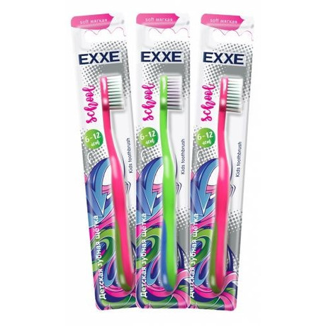 Зубная щётка мягкая для детей EXXE School. Особые мягкие и ультратонкие щетинки деликатно и бережно воздействуют на зубную эмаль, не травмируя поверхность зубов. Удобный изгиб ручки позволяет легко и без дополнительного давления на дёсны очистить дальние поверхности. Полированные щетинки имеют идеальную скругленную форму, что с одной стороны, позволяет добиться более высокого очищающего эффекта, а с другой – деликатно и бережно воздействуют на зубную эмаль, не травмируя поверхность зубов.