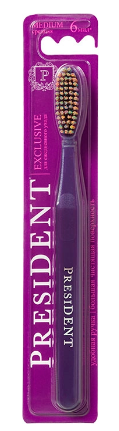 Бренд PresiDENT. ПРЕЗИДЕНТ ЗУБНАЯ ЩЕТКА ЭКСКЛЮЗИВ - для тех, кому чистка зубов в удовольствие, обеспечивает бережный уход за зубами. Большая головка обеспечивает быстрое очищение внешних, внутренних и жевательных участков зубного ряда. Закругленные нейлоновые щетинки Medex деликатно полируют зубную эмаль и не травмируют десны. Специально подобранная жесткость щетины (6 МИЛ*) позволяет эффективно очищать зубной налет, а также предотвращает образование зубного камня. Регулярное использование зубной щетки позволяет качественно удалять бактериальный налет, препятствуя формированию зубного камня, поддерживать освежать и чистоту дыхания.