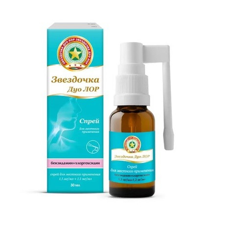 | Звездочка Дуо ЛОР | Спрей д/местн. прим. 1.5 мг/мл+1.2 мг/мл: 30 мл фл. рег. №: ЛП-006371 от 27.07.20 *- Действующее* |